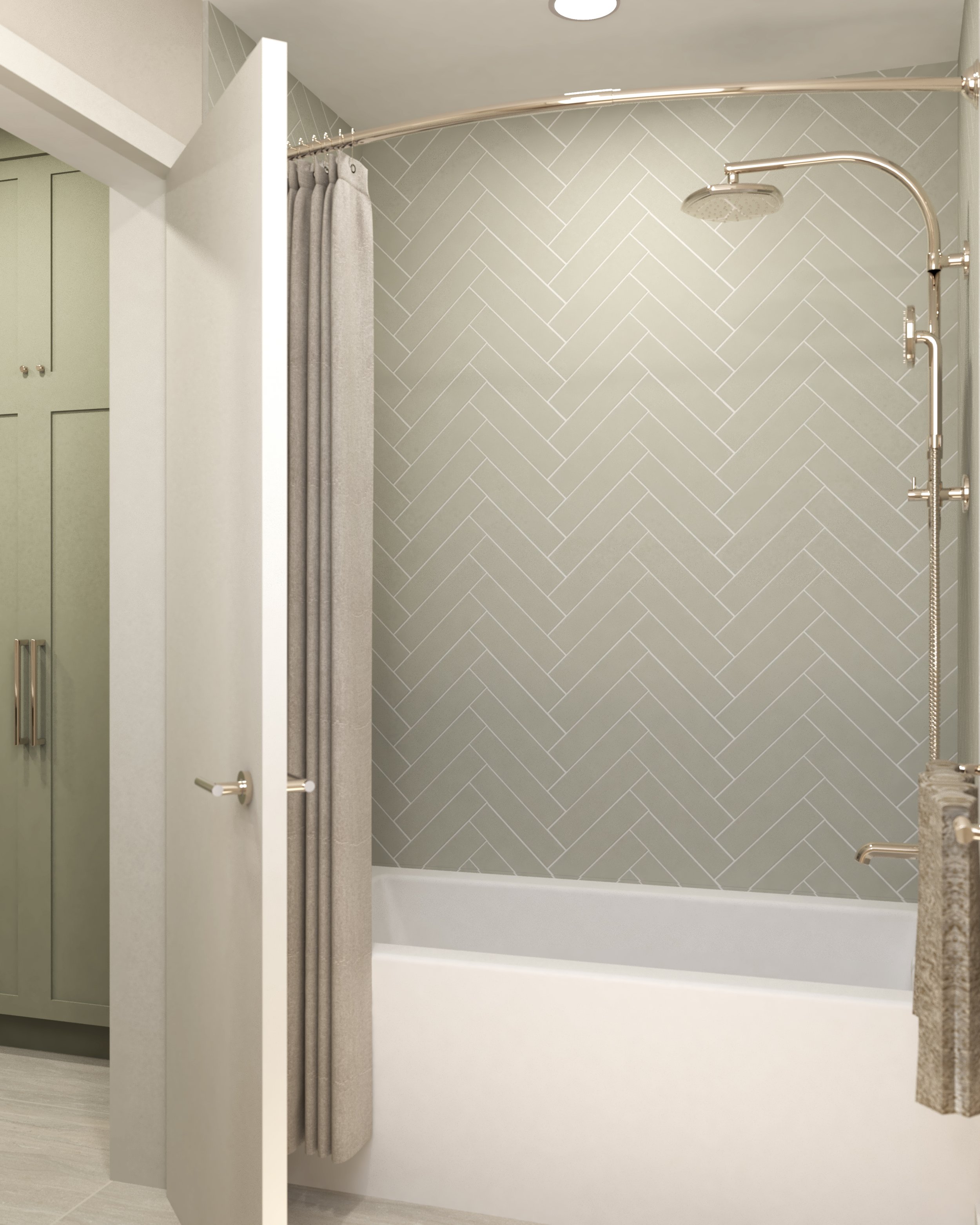 This shared bathroom space needs to maintain adequate circulation and maximize functional storage to suit all of the family’s users. We have redesign the vanity with more usable drawer space, added a millwork linen cabinet, and integrated a niche to new tub/shower design.