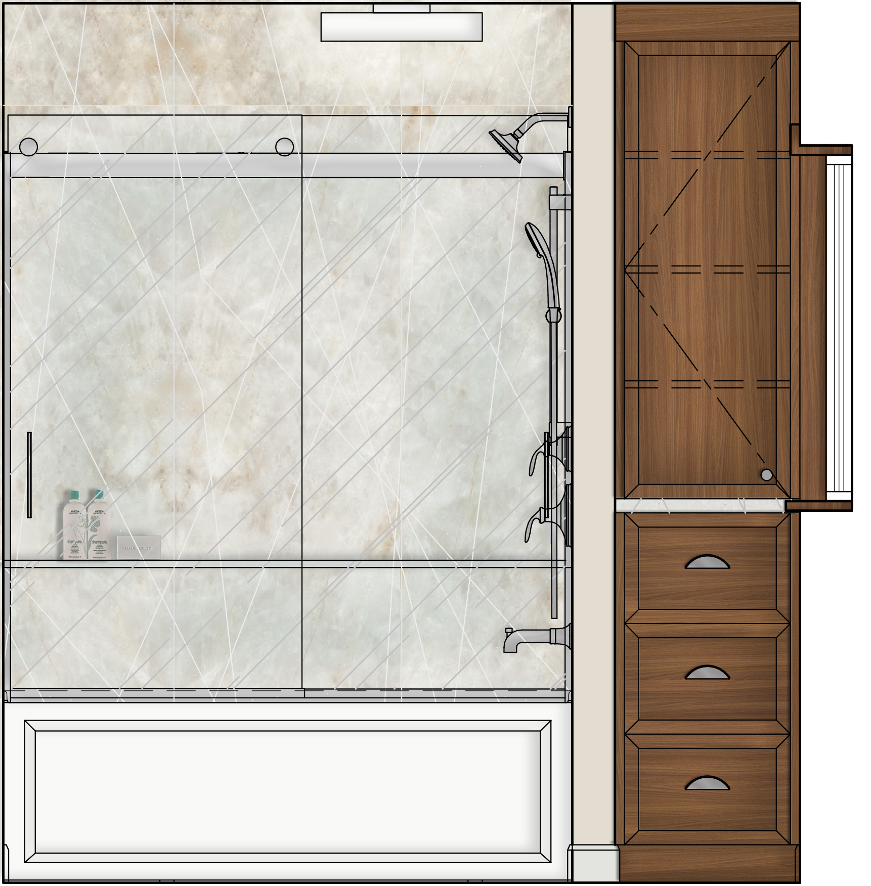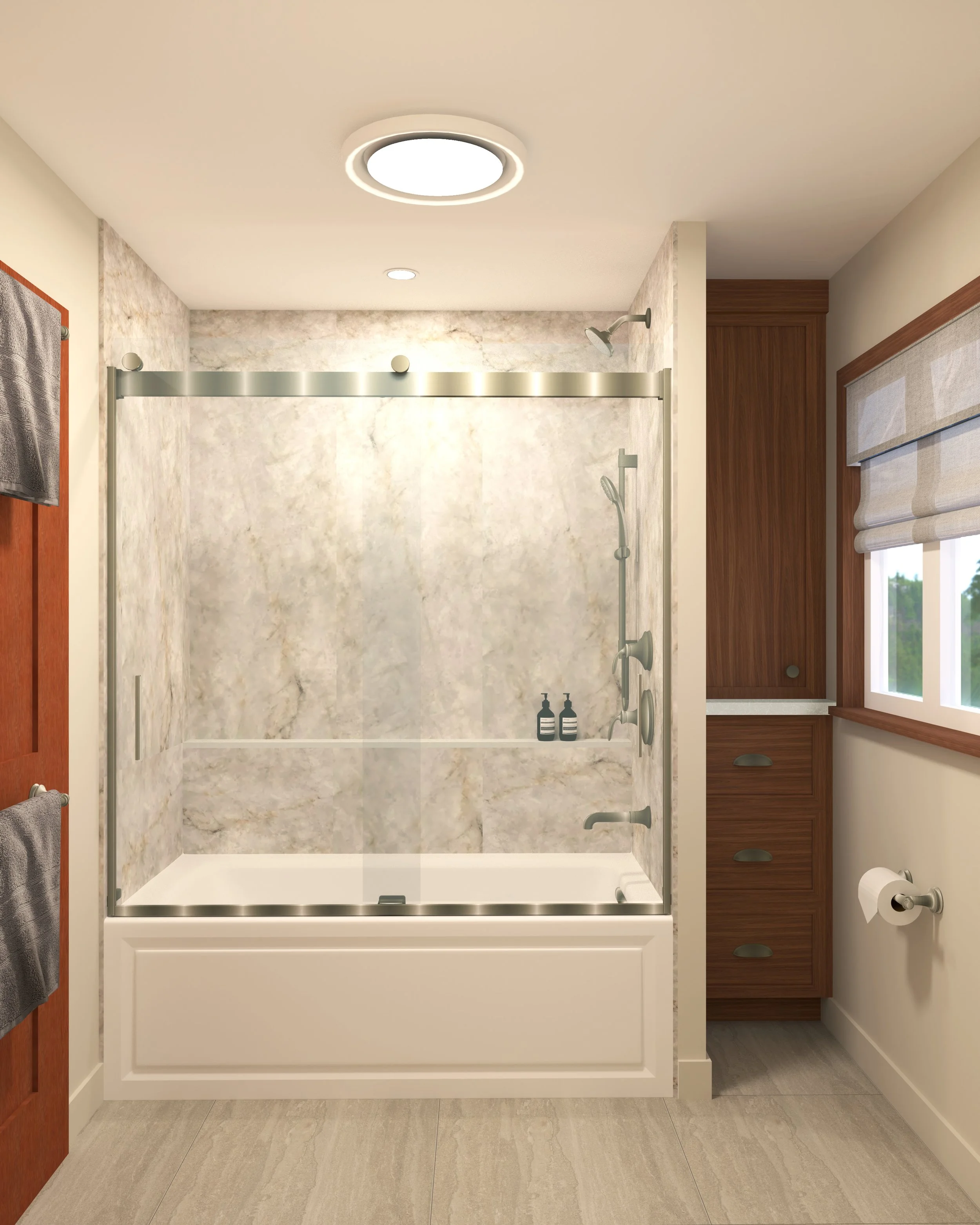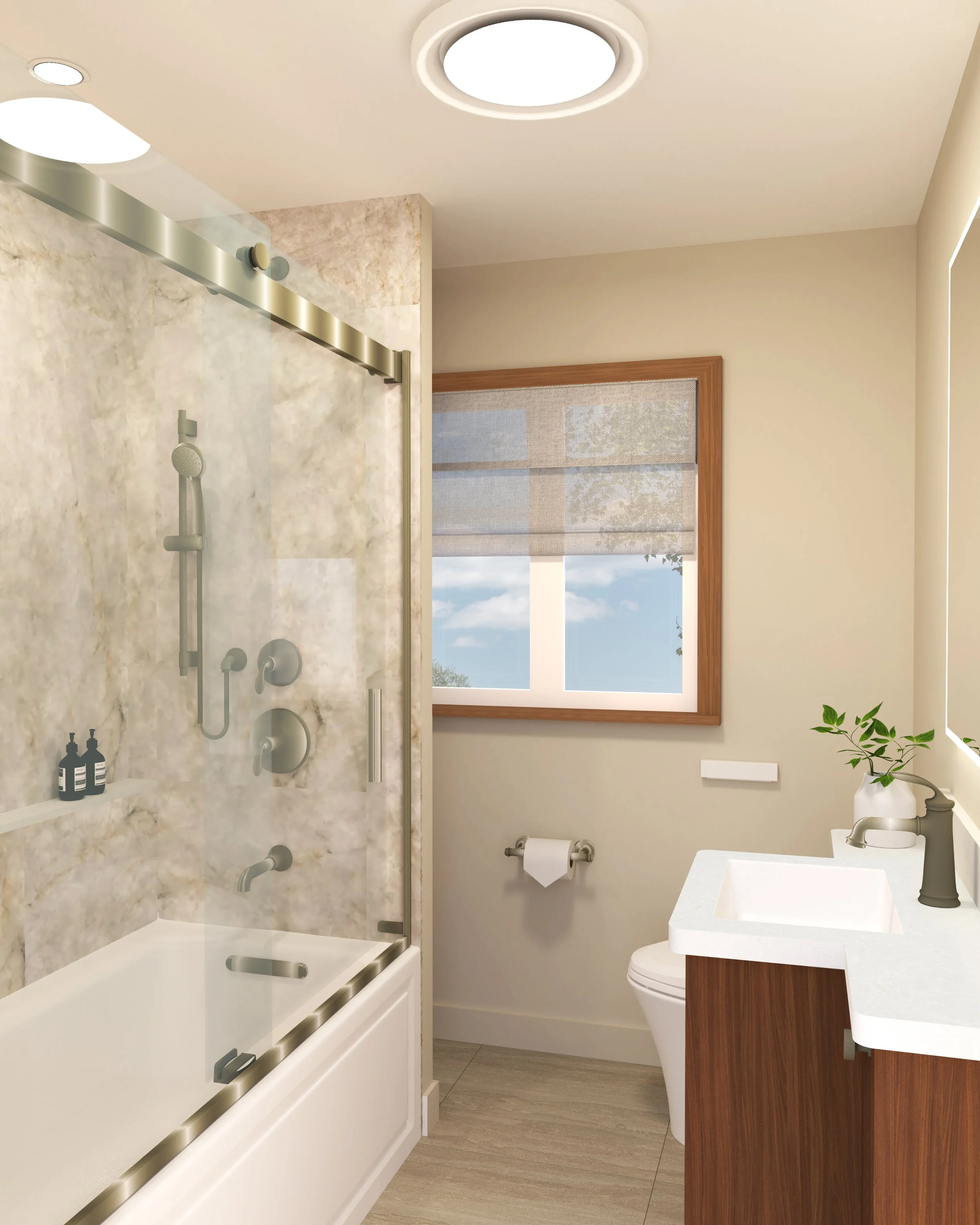 In order to transform this bathroom space we are focused on both aesthetics and functionality. We have maximized storage space within the small dimensions by designing a custom vanity and millwork unit that utilizes both cabinets and drawers. The tub / shower is reworked for a whirlpool bathtub with an enclosed glazing system and a multifunctional shower head and hand shower. In keeping with the character and style of the house we are adding warmth and natural references through wood, large format veined tiles and brushed brass hardware.