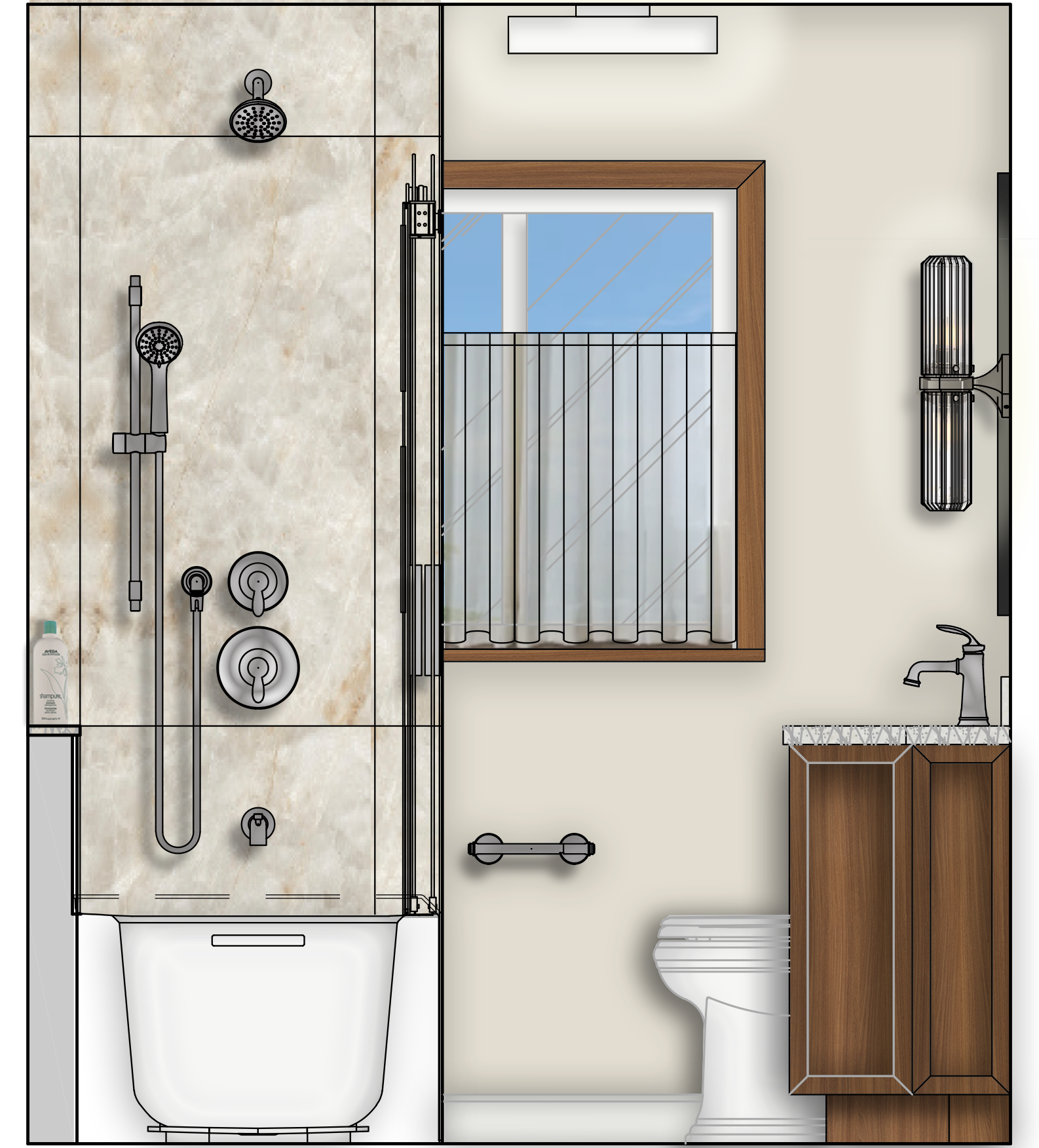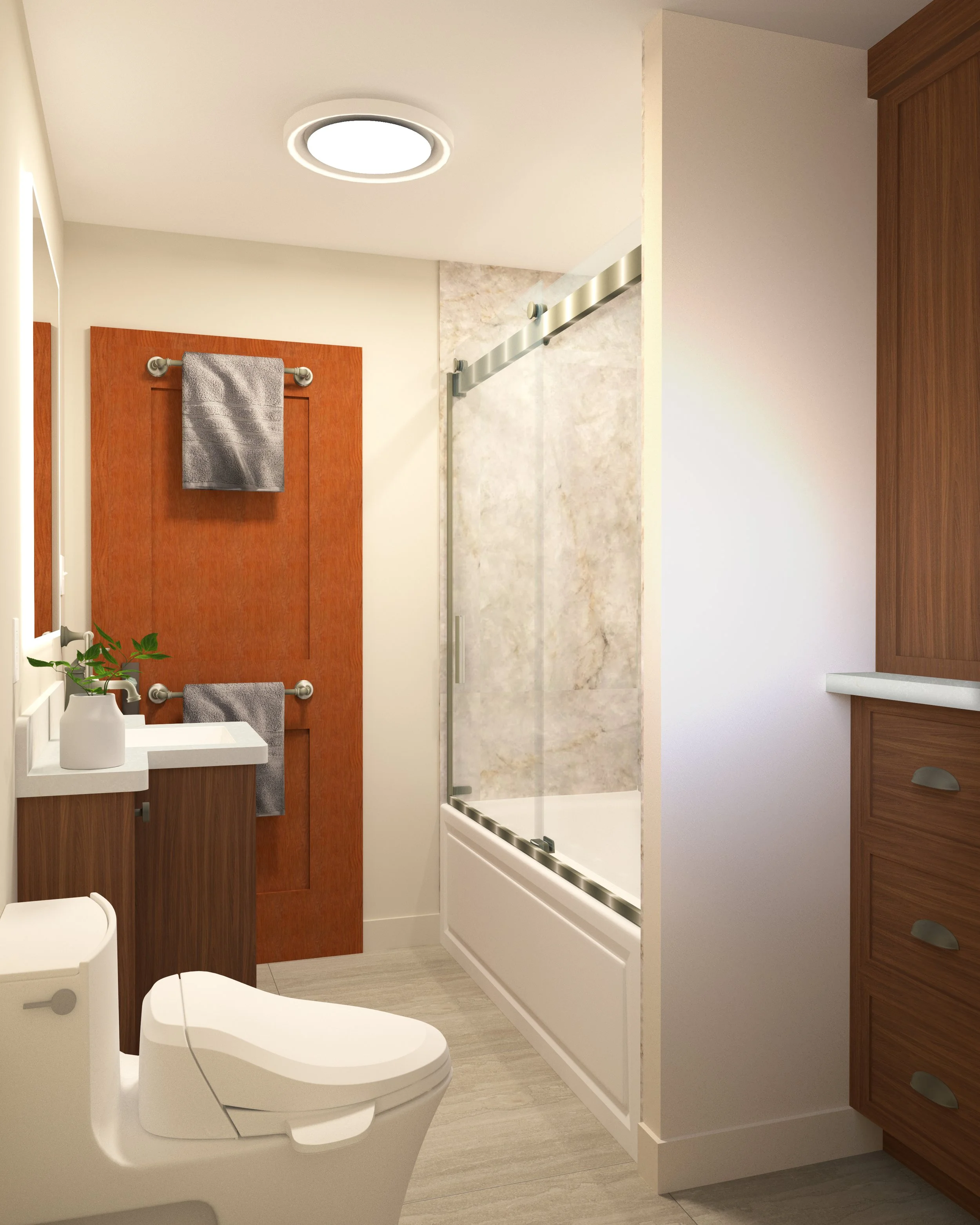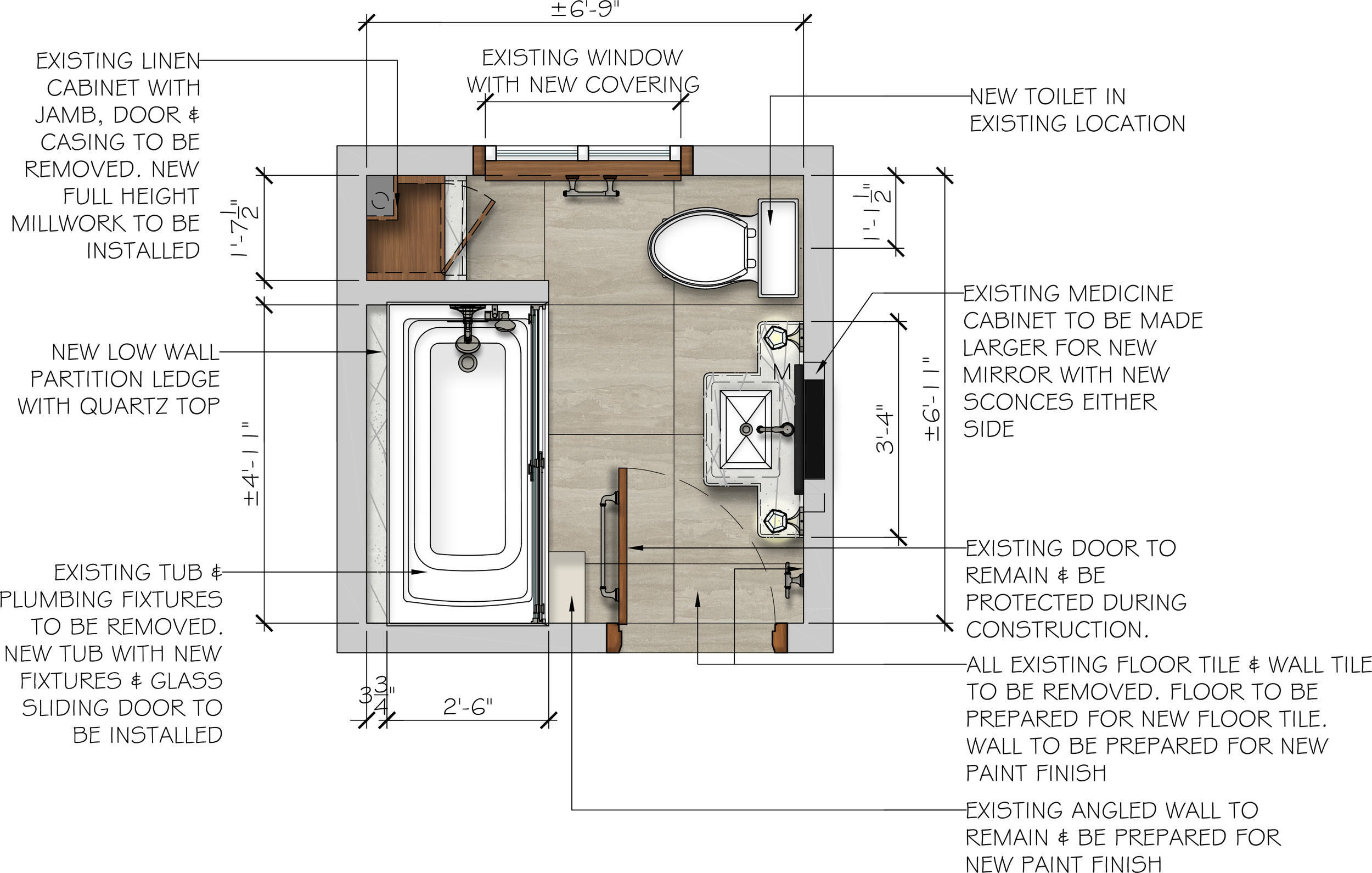In order to transform this bathroom space we are focused on both aesthetics and functionality. We have maximized storage space within the small dimensions by designing a custom vanity and millwork unit that utilizes both cabinets and drawers. The tub / shower is reworked for a whirlpool bathtub with an enclosed glazing system and a multifunctional shower head and hand shower. In keeping with the character and style of the house we are adding warmth and natural references through wood, large format veined tiles and brushed brass hardware.